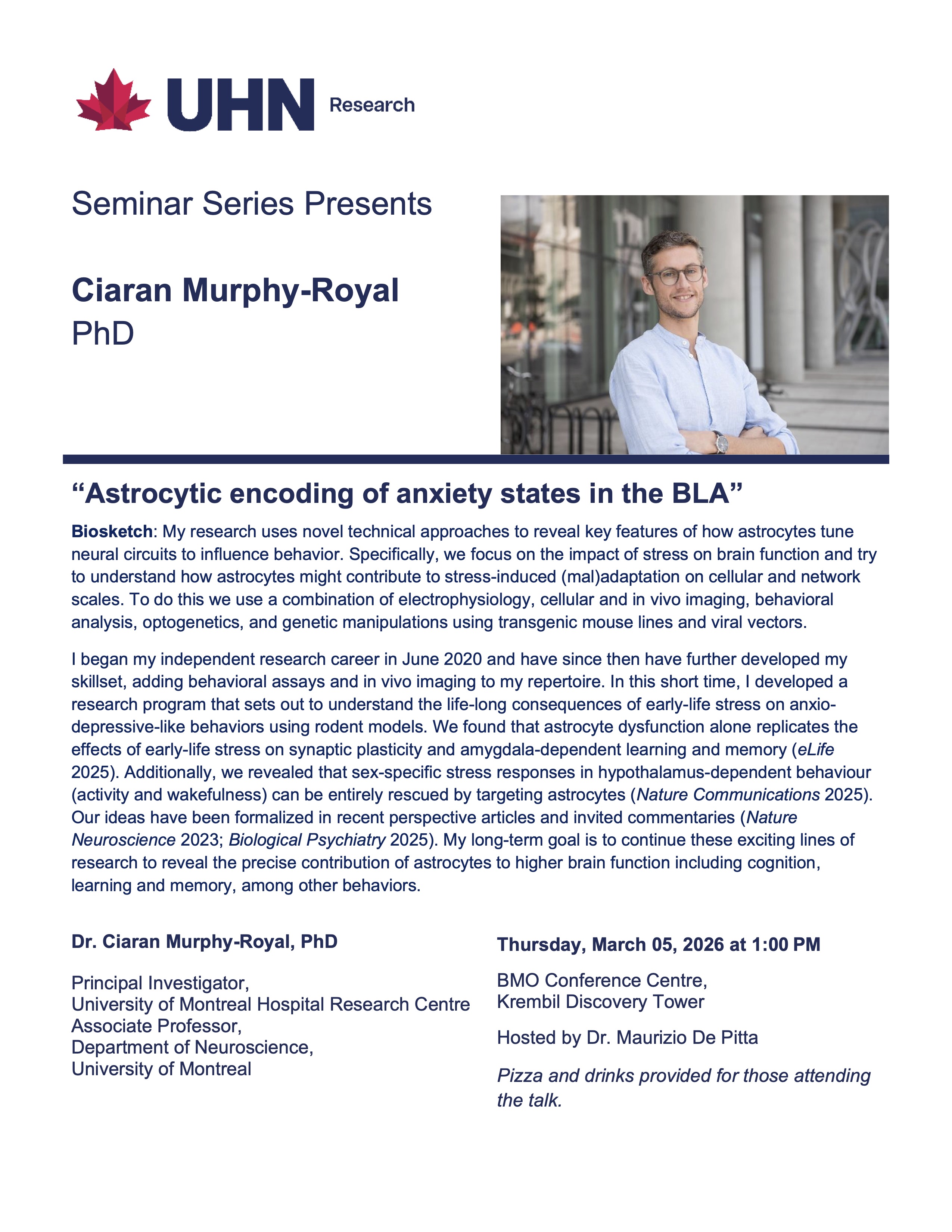 Dr. Ciaran Murphy-Royal investigates how astrocytes regulate neural circuits and behavior, with a focus on stress-induced maladaptation. His research integrates electrophysiology, in vivo and cellular imaging, behavioral analysis, optogenetics, and genetic approaches in transgenic rodent models. Since establishing his independent program in 2020, he has demonstrated that astrocyte dysfunction drives synaptic and behavioral deficits linked to early-life stress and identified sex-specific mechanisms rescuable by astrocyte targeting.