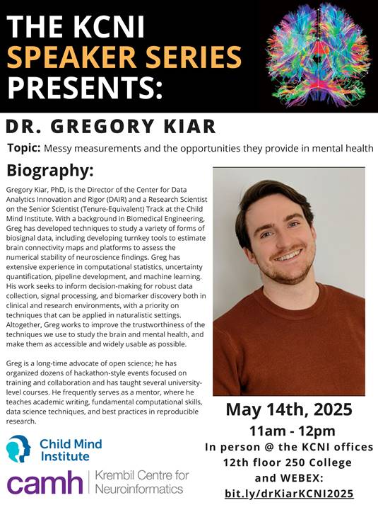 The Krembil Centre for Neuroinformatics is excited to host Dr. Gregory Kiar from the Child Mind Institute in our offices and virtually on Wednesday May 14th from 11:00am – 12pm.